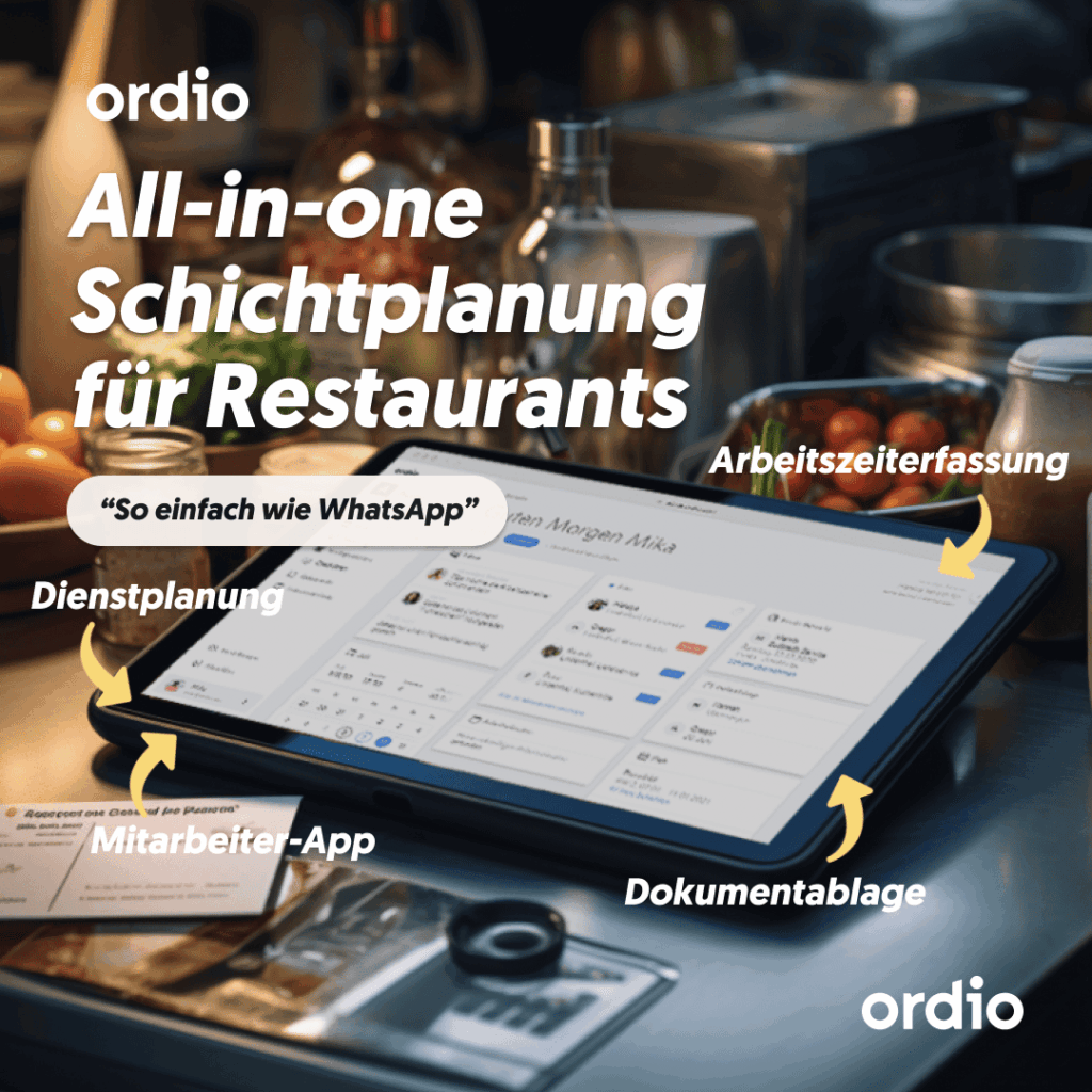 In der Gastronomie, Hotellerie und im Einzelhandel ist die Personalplanung und Arbeitszeiterfassung eine ständige Herausforderung. Schichtpläne ändern sich kurzfristig, Aushilfen springen ein, und Mitarbeiter arbeiten flexibel – gleichzeitig müssen alle Arbeitszeiten korrekt für die Lohnabrechnung dokumentiert werden. Mit Ordio Zeiterfassung gehört die Zettelwirtschaft endgültig der Vergangenheit an. Erfassung von Arbeitszeiten digital, flexible Zeiterfassung für Mitarbeiter und Schichtverwaltung werden zu einer einfachen Routine. Ob auf Smartphone, Tablet oder am Terminal im Betrieb – mit Ordio hast du jederzeit transparente Arbeitszeiterfassung, erleichterst die Lohnabrechnung und sparst wertvolle Zeit bei der Personalverwaltung.